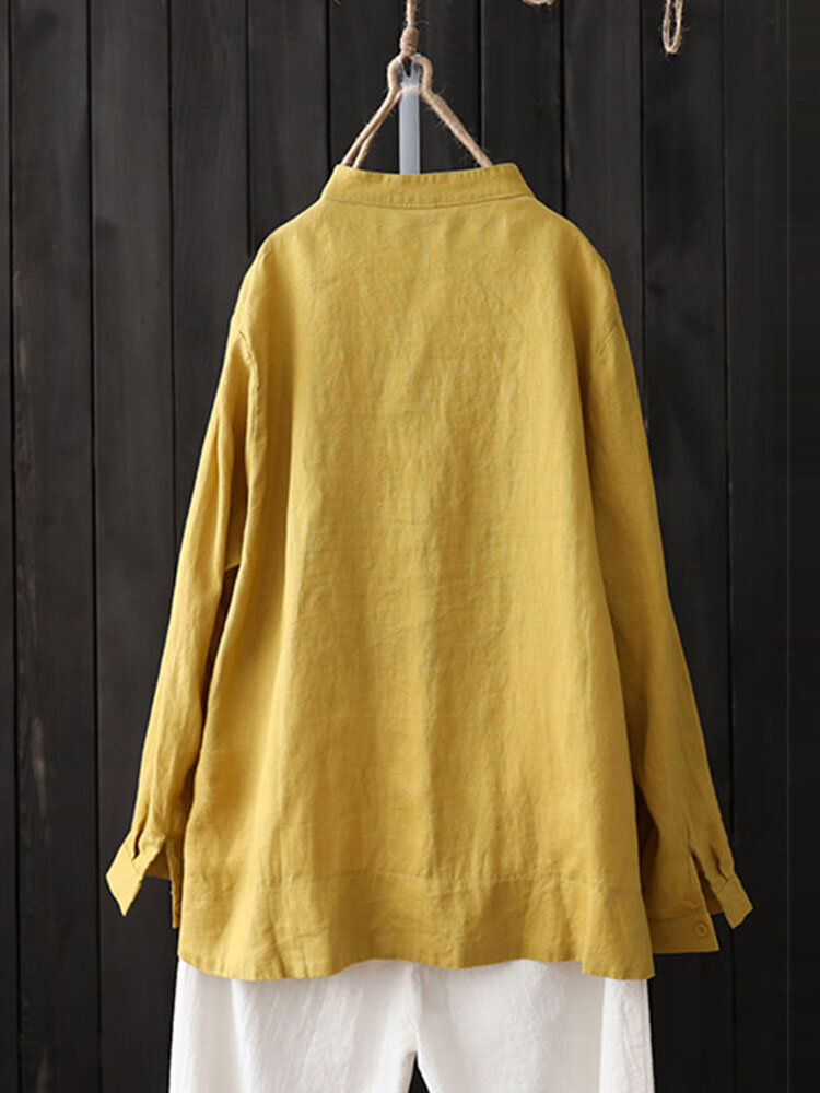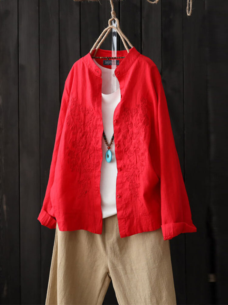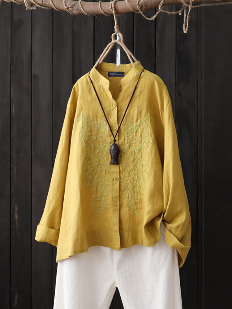 خمر المرأة عارضة مطرزة زر كم طويل بلوزة