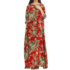 خمر المرأة المطبوعة الياقة المدورة فستان طويل الأكمام مع جيوب