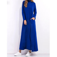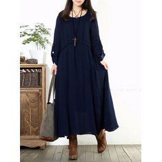 عارضة المرأة طويلة الأكمام لون نقي المدورة جيب فستان طويل