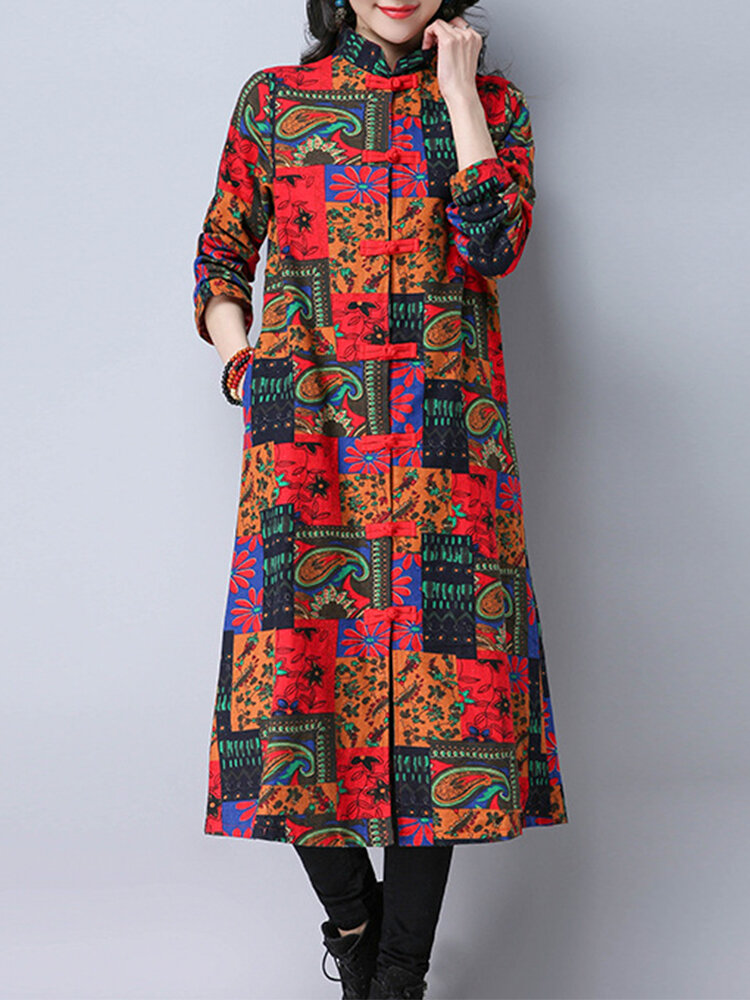 المرأة العرقية كم طويل الطباعة المرقعة الجيب اللباس