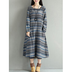 عارضة المرأة طويلة الأكمام مخطط س الرقبة فضفاض اللباس مع الجيب